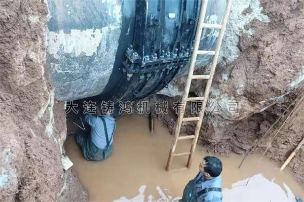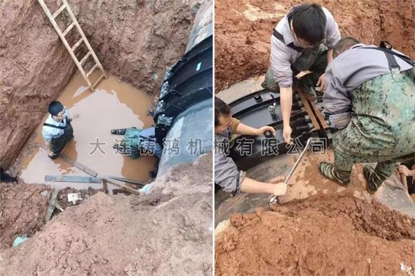 福建東南水務DN2200的球墨鑄鐵管發(fā)生泄漏,漏點在承插口處,由于安裝鑄管的時候因為地基下沉造成唇口泄漏,管道有20~50mm的變形,此處管道為主管道,不能停水,使用4片的2米2 的承插口管道修補器進行修復,1小時完成安裝,不再泄漏。