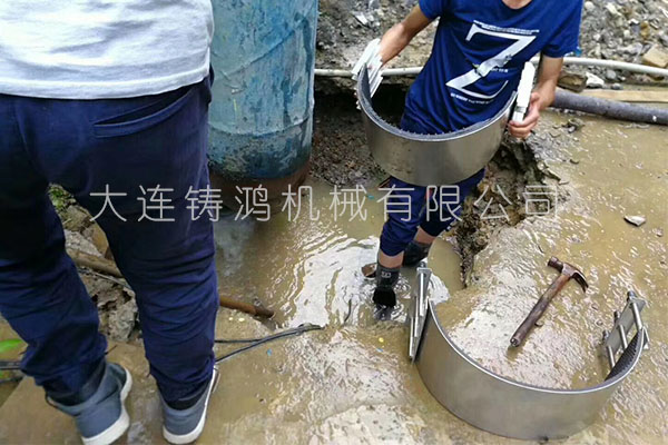 現(xiàn)場工況:貴州都勻水務某管段發(fā)生泄漏,經過現(xiàn)場工作人員排查,鎖定一鑄鐵彎頭處,管徑DN400,管道帶有輕微變形,現(xiàn)場操作空間狹小,水從漏點處噴出,壓力較大,使用鑄鴻彎頭修補器帶壓進行修復。(泄漏處)(安裝修補器)(安裝修補器)安裝時間:在現(xiàn)場人員的齊心協(xié)力下,用時20分鐘便完成修補。