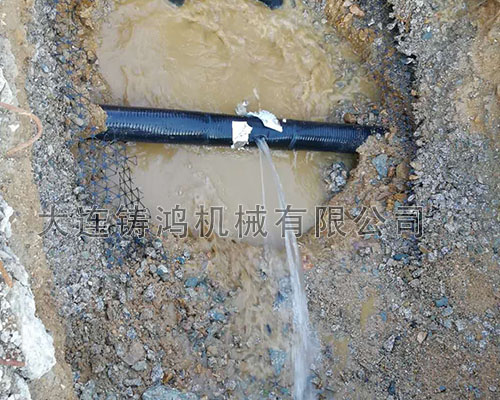 山東青島某水務(wù)非標(biāo)通水管嚴(yán)重變形,變形長度為300mm,之前使用鑄鐵哈夫節(jié)進(jìn)行堵漏,但是堵漏效果不好,安裝后依然發(fā)生漏水,現(xiàn)在改用“鑄鴻”板式修補(bǔ)器進(jìn)行修復(fù),管道堵漏圓滿成功。