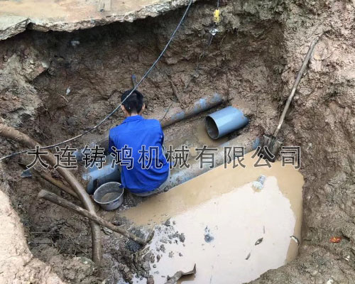 廣東佛山施工現(xiàn)場非標(biāo)280管中間發(fā)生斷裂,由于漏點(diǎn)較大,修復(fù)起來較為困難,施工人員決定切斷破損管處采用一段新管進(jìn)行連接,由于備貨庫存里沒有相同的管材,于是用了一段鋼管,使用“鑄鴻”雙卡管道連接器進(jìn)行快速連接。