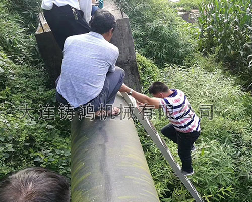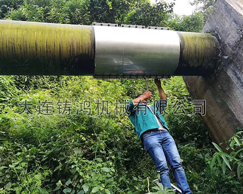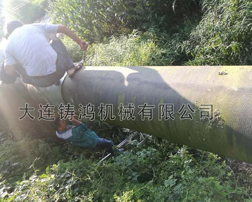 DN600的球墨鑄鐵管道被落石砸中,管道發(fā)生泄漏并在漏點處伴有嚴重的管道變形,長度達800mm,由于是架空管道,管離地面8米左右,所以需要采取較為方便的修補方式,降低作業(yè)的危險性,最終選擇了“鑄鴻”板式修補器進行快速修復,降低作業(yè)難度。