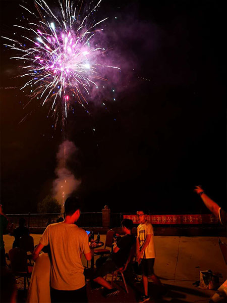 期間公司給了我們大大的驚喜,一場絢麗的煙花,照亮了整個星空。赤橙黃綠青藍紫,樣樣俱全,姹紫嫣紅,把夜空裝點得美麗、婀娜,把大地照射得如白晝.“通!”地面上又升起個通體發(fā)紅的大火球.它飛到半空,“啪”的一聲,化作千萬顆小火星飛濺開來,拖著長長的、閃光的尾巴緩緩落下,好似翩飛的蝴蝶,從空中旋落;又好似被風(fēng)吹散的蒲公英,不知是哪個調(diào)皮鬼,給它們涂上七彩的顏色。